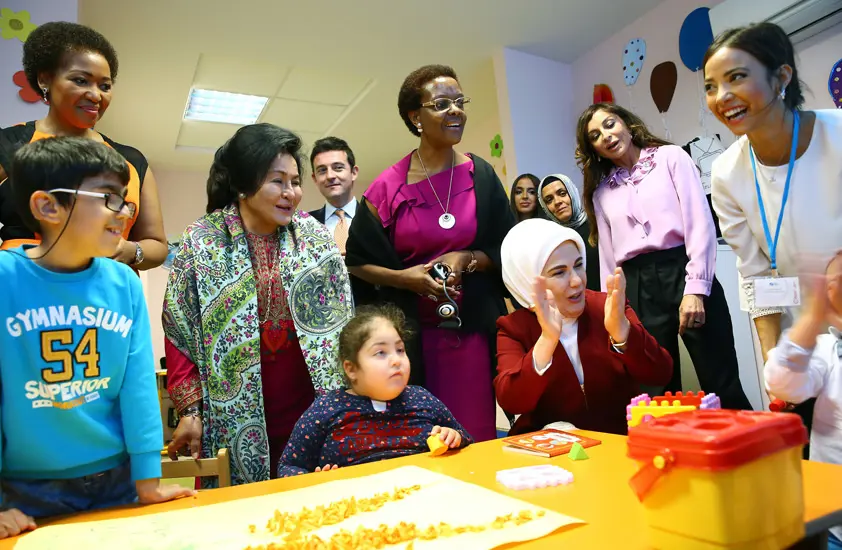 Konuk lider eşleri ile ve merkezde hatıra fotoğrafı çektiren Emine Erdoğan, burada eğitim gören çocuklara da çeşitli hediyeler verdi. Ziyaretinde Emine Erdoğan’a kızı Sümeyye Erdoğan, Antalya Milletvekili Sena Nur Çelik, ve Dışişleri Eski Bakanı ve Milletvekili Mevlüt Çavuşoğlu’nun eşi Hülya Çavuşoğlu da eşlik etti.