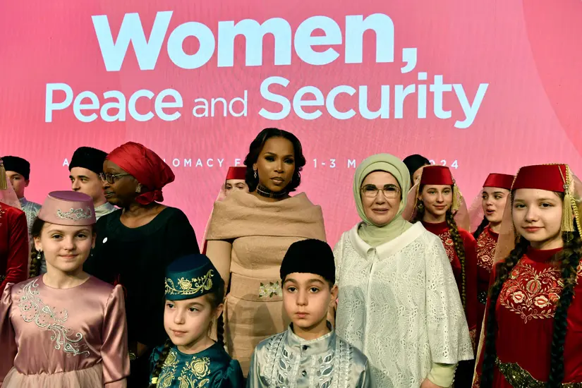 Savaşın derinden etkilediği kadınların, barış için söyleyecek çok sözünün olduğuna dikkati çeken Emine Erdoğan, şu değerlendirmelerde bulundu: "Büyük bir incelikle inşa ettiği yuvası yanıp küle dönen, canından parça evladının acısını gören, kök saldığı toprakları terk etmek zorunda kalan kadınlar barışın kıymetini herkesten çok daha iyi bilir. Bu konuda, 24 yıl önce, küresel bir irade ortaya konmuş; Birleşmiş Milletler Güvenlik Konseyi'nin 1325 sayılı kararı ile kadınların, barış süreçlerine katılımı güvence altına alınmıştı. Ancak ne yazık ki çatışmanın birincil mağduru, toplumların inşasının ana aktörü olan kadınların arabuluculuk ve barış süreçlerine etkin bir şekilde dâhil edilmediğini görüyoruz. Oysa araştırmalar, kadınlar sürece dâhil olduğunda uzlaşma olasılığının yükseldiğini ve barışın daha uzun soluklu hâle geldiğini gösteriyor. Kadınların, farklı gruplarla iş birliği yapma ve birlikte çalışmaya yatkın tabiatı ve sosyal meselelere olan duyarlılıkları, barış süreçlerindeki başarı şansını artırıyor. Unutmamalıyız ki kalıcı ve sürdürülebilir bir barış, kimsenin geride bırakılmadığı bir süreçten doğar. Bilhassa, toplumun temel ve dönüştürücü bir parçası olan kadınların dâhil edilmediği bir barış sürecinin başarı ile sonuçlanması beklenemez. Bu nedenle, diplomasiyi öne çıkarırken kadınların karar verici noktalarda olduğuna emin olmalıyız."