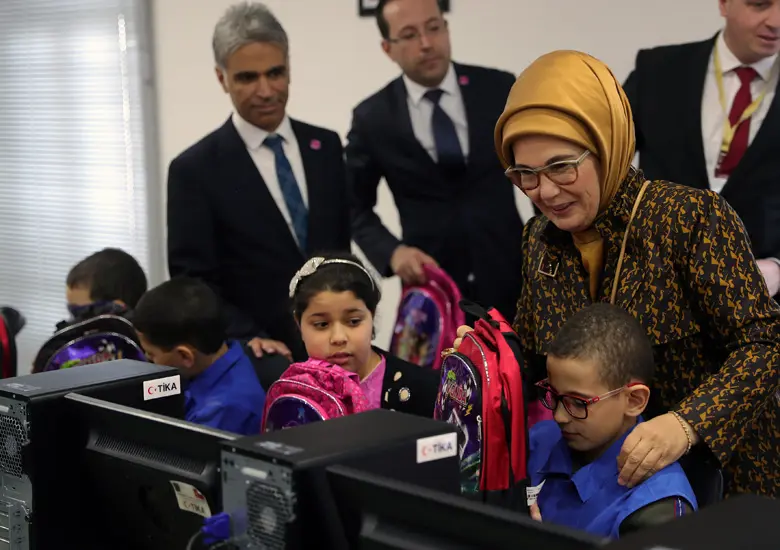 Okulun bilgisayar laboratuvarının açılış törenine katılan Emine Erdoğan, çocukların gösterilerini izledi, sınıfları gezerek TİKA'nın yaptığı tadilat ve teknik ekipman destekleriyle ilgili bilgi aldı.